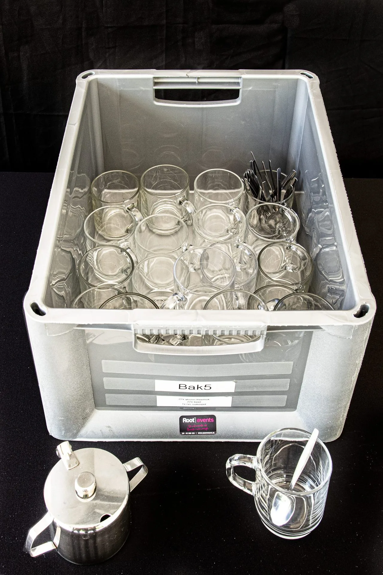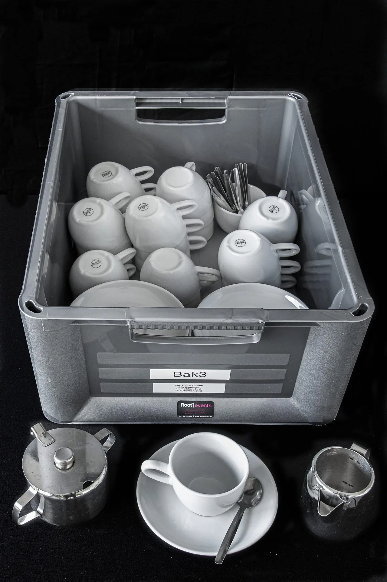 Kop en schotel + theelepel / krat 24 stuks + suikerpot & roomkan RVS