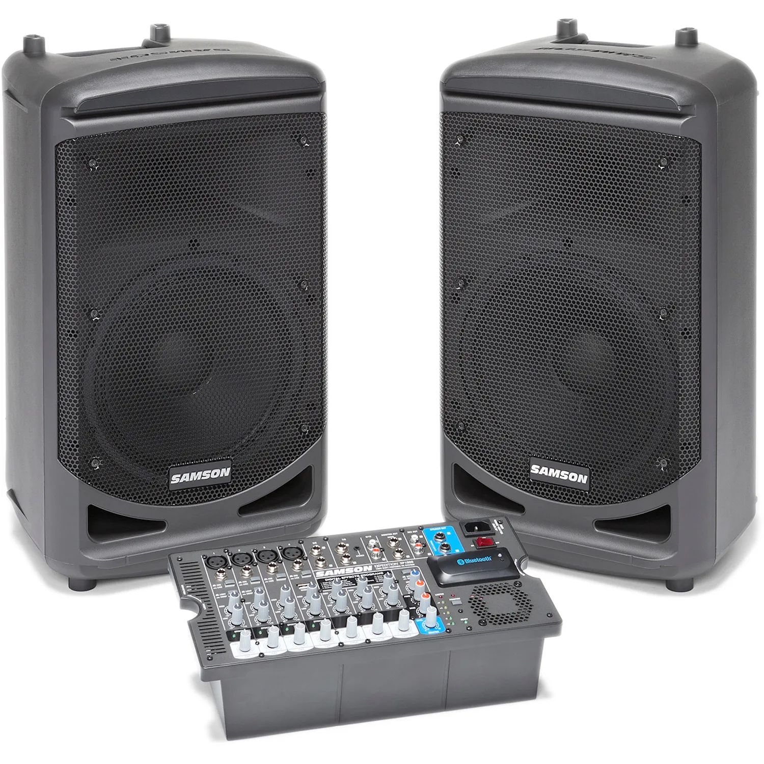 Geluidsset met 2 actieve-speakers op statief en microfoon
